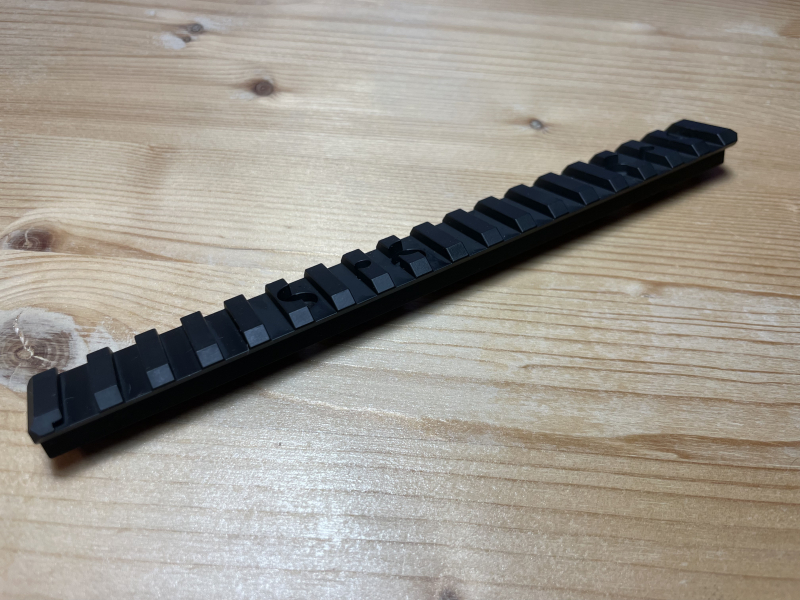 Die Edelstahlschiene ersetzt die Standardschiene und ist ein wenig höher, damit kann auch bei montiertem Handschutz ein Zielfernrohr mit Sonnenblende und Vorneigung montiert werden.