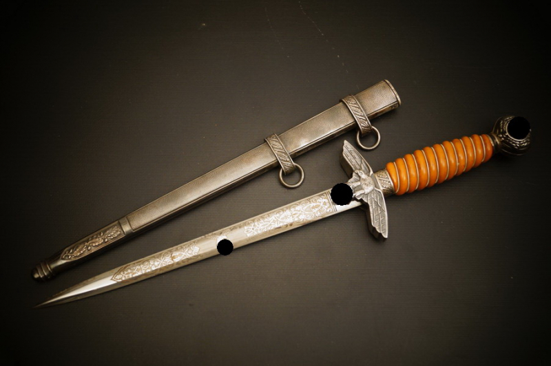 Fundzustand. Perfekt versilberte Scheide mit gutem saugendem Sitz der Klinge. Scheide, grau getönt. Klinge aus Stahl geschmiedet und mit beidseitiger Ätzung. Griffstück aus Trolon ohne Risse und mit Alugespinst Wicklung. Aluknauf mit teils noch erkennbaren goldenen HKs. Dolch hängt mit guter Neigung. Sehr schönes Stück.