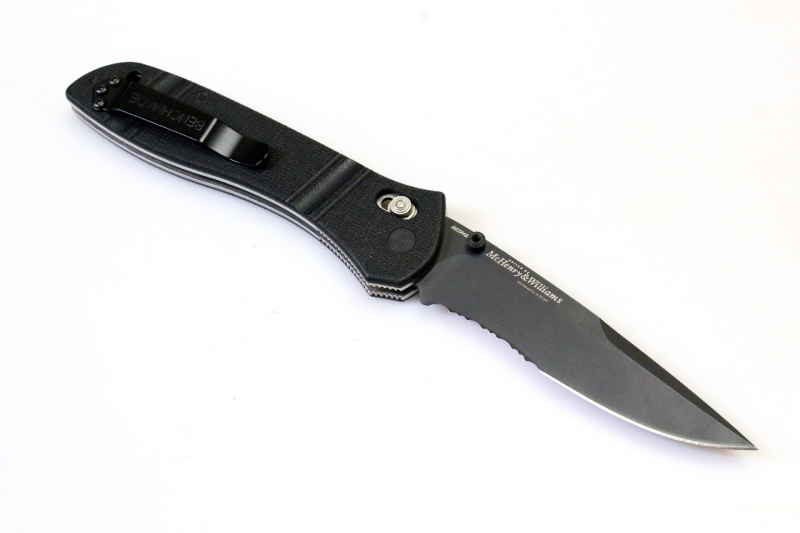 Beschichtete Drop-Point Klinge. Terzseitig bezeichnet "MacHenry & Williams" über "U.S. Patent No. 5.737.41", neben "M2HS". Quartseitig Firmenlogo "Benchmade USA". Die Klinge partiell mit Wellenschliff versehen.