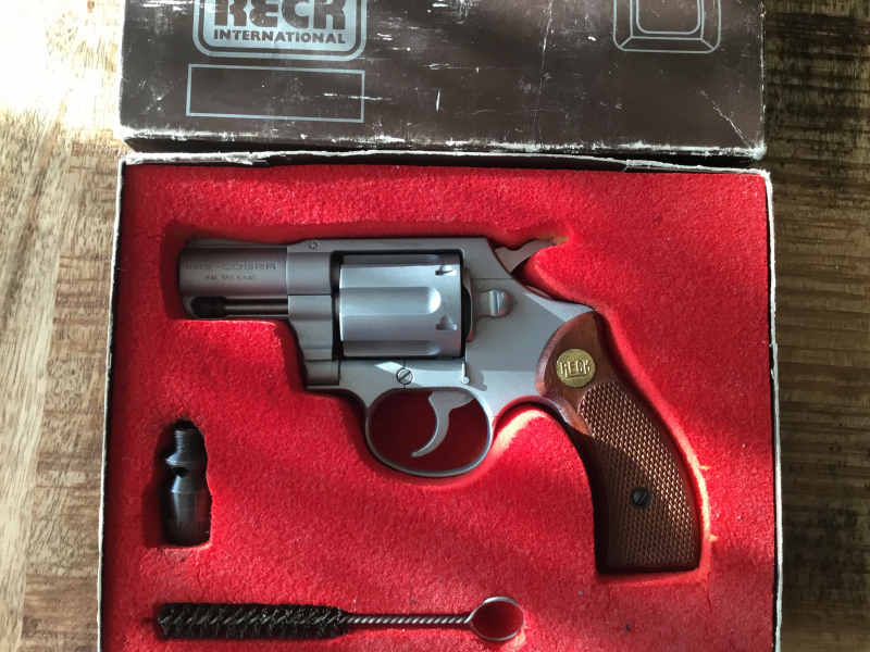 Ich biete einen außergewöhnlich schönen Reck Cobra Revolver an!Das Kaliber ist 9mm/.380 Knall und die PTB ist die 216.Er ist noch original Made in West Germany,das Beschussjahr kann ich nicht erkennen.Ich habe es nicht gewagt diesen praktisch makellosen Revolver zu schießen,die Trockenfunktion ist gegeben.Generell macht er einen ungeschossenen Eindruck,ist eher ein Sammlerrevolver oder für die Vitrine!Er befindet sich im originalen Karton der nicht mehr ganz der frischeste ist,dabei ist der Abschussbecher und die Bürste.Ich biete als Privatmann an und gebe keine Garantie und nehme den Artikel auch nicht zurück.Die Bilder sind Bestandteil der Erklärung,meine Angaben habe ich nach bestem Wissen und Gewissen gemacht.Spätere Forderungen nach dem ein oder anderen Euro aus welchem Grund auch immer ignoriere ich.Ich biete die bestmögliche Transparenz,der Käufer erfährt wann sein Geld bei mir eingegangen ist,wann ich versende und zum Schluss bekommt er die Sendungsnummer.Wer mit allem einverstanden ist kann hier ein schönes Stück deutscher Zeitgeschichte erwerben welches in dieser Art nur sehr selten angeboten wird.