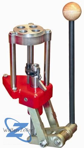 Die Presse besitzt eine Kopfplatte für 4 Matrizen und Auto Index Steuerung. Bei jeder Hebelbewegung dreht sich die Kopfplatte um 1/4 Umdrehung. Das bedeutet Zeitersparnis, die Hülse wird nur 1 mal eingesetzt und nach der 4. Hebelwegung ist die Patrone fertig. Falls eine normale 1-Stationen Presse benötigt wird, lässt sich die Auto Index Steuerung mit wenigen Handgriffen entfernen. Da lassen sich auch Hülsen mit einer Länge bis zu 4" laden. Die 4-fach Kopfplatte erlaubt separates Crimpen, z. B. mit der LEE Factory Crimp Matrize.