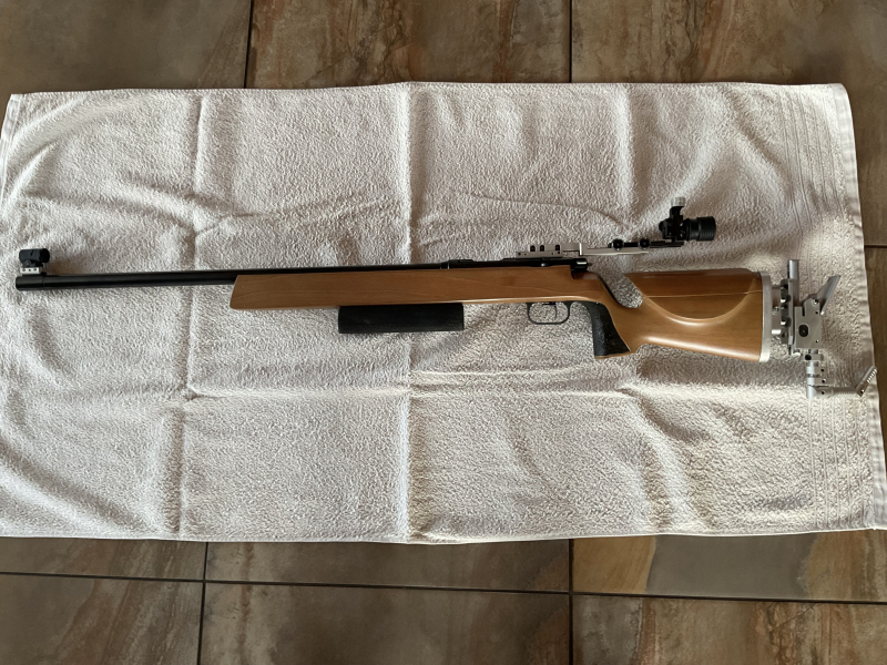 Der Schaft wurde für eine kleinere Schützin (ca 1,60m) abgeändert, könnte aber mit Distanzen wieder verlängert werden. Zuletzt wurde mit dem KK Auflage geschossen, kann aber für andere Disziplinen umgebaut werden.