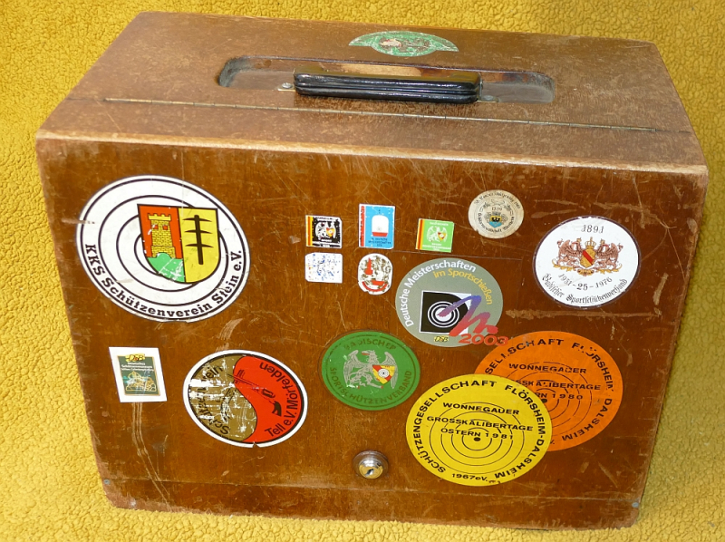 Zum Verkauf kommt der abgebildete gebrauchte Waffenkoffer aus Holz.