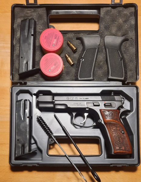 Mit dabei sind 200 Schuss Munition, 2Magazine, 2 Ladehülsen, 2paar Griffschalen und