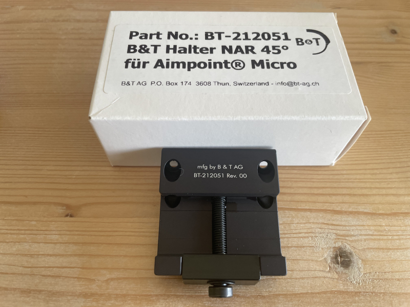 ich biete hier die 45 Grad Montage der Firma B & T aus der Schweiz an (SKU: BT-212051; https://bt-ag.ch/en/produkt/bt-mount-nar-45-for-aimpoint-micro-t1-t2/), die Montage ist neuwertig und weißt keine Gebrauchsspuren auf! Ich habe sie vor ca. 9 Monaten bei https://www.diewaffenbrüder.de/Zubehoer/B-T-Montage-45-fuer-Aimpoint-Micro-beidseitig.html gekauft, die Rechnung liegt vor!