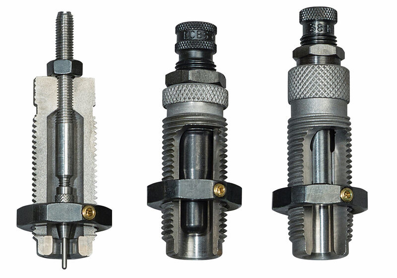 Der Matrizensatz besteht aus einer Sizer-Matrize aus Stahl, einer Expander-Matrize und einer Roll-Crimp-Sitz-Matrize.