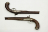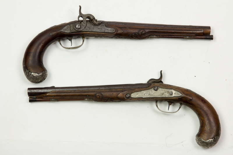 Paar Pistolen, Mitte 18. Jh., ehemals Steinschloss, um 1820 mit neuen Perkussionsschlössern versehen, Silbergarnituren in feiner Juwelierarbeit, gemarkt mit N in Rhombus, elegante Nußbaumschäftung mit feiner Schnitzerei verziert, Daumenbleche mit gespiegelten "LC" unter Fürstenhut, Horndoppler fehlen, Läufe gebräunt, Ausbruch an der Laufmündung (eine Pistole), unberührtes Paar fürstlicher Pistolen, zu reinigen, Gebrauchsspuren, die Buchstaben "LC" könnten für Landgraf Christian stehen. L: 39 cm. www.beyreuther.de