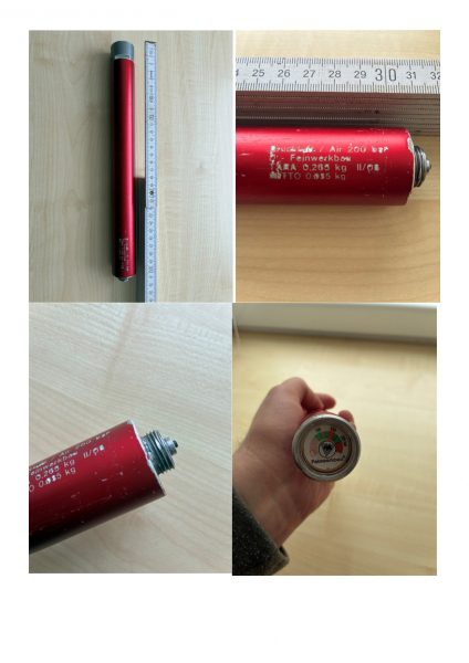 Sie kaufen hier eine Pressluftkartusche von Feinwerkbau. Diese war für das LG Junior verwendet worden. Der TÜV ist bereits seit längerem abgelaufen, II/05. Der Druck hält aber immer noch. Das Gewinde hat allerdings einen Schlag abbekommen.