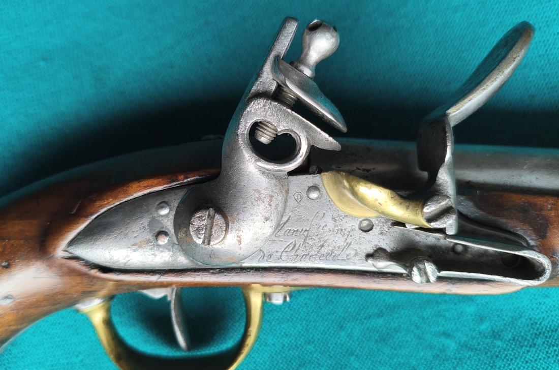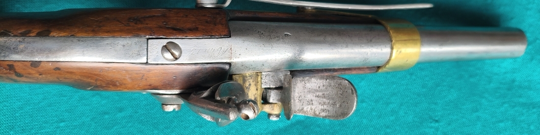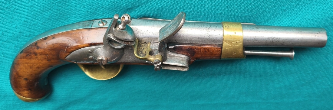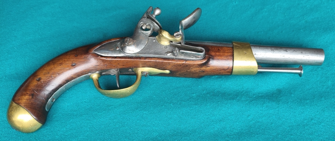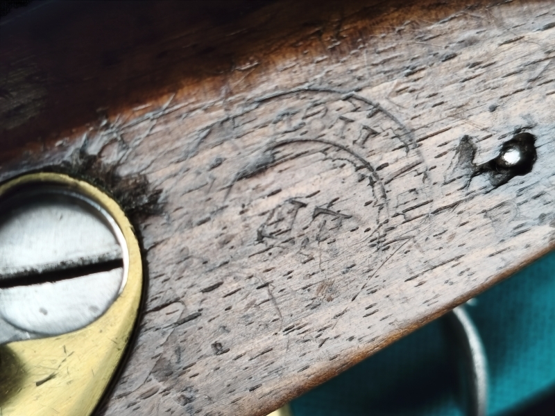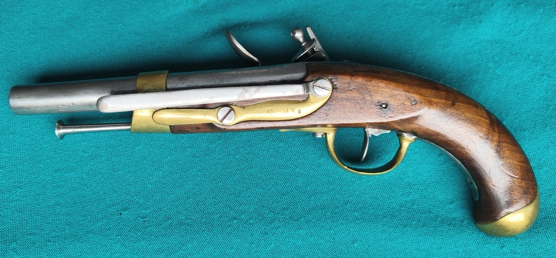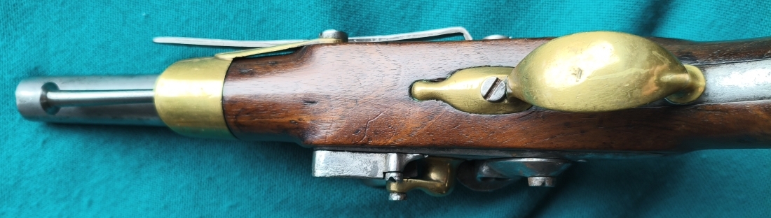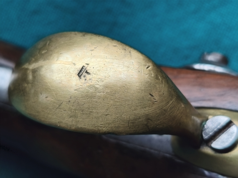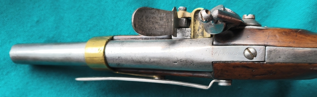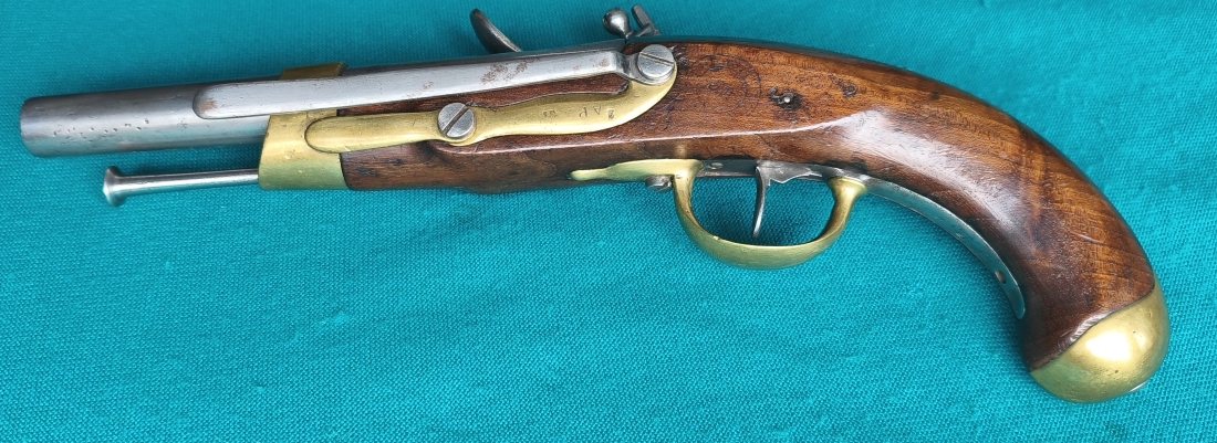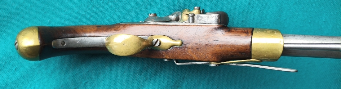 Mehrfach gestempelter Lauf, Kal. ca. 17,5mm glatt. Signiertes Schloß sowie Abnahmen. Beide Rasten gute stramme Funktion. Gestempelter Nussholzschaft. Messingbeschläge mit Abnahmen. Montierter Gürtelhaken. Orig. Ladestock mit Stempelung und Gewinde. Gesamtlänge 36,5cm.