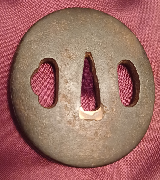 Tsuba aus Eisen für ein japanisches Wakizashi, schöne und interessant gearbeitet Arbeit mit Verzierungen aus Messing (oder Gold?). Mit deutlichen Montagespuren und Altersspuren, teilweise rostig bzw. rostnarbig. Durchmesser 5,5 x 5,1 cm. Mit gepolsterter Holzbox.