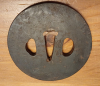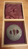 Tsuba aus Eisen für ein japanisches Katana, schöne und interessante Signierung. Mit deutlichen Montagespuren und Altersspuren, teilweise rostig bzw. rostnarbig. Durchmesser 7,5 cm. Mit gepolsterter Holzbox.
