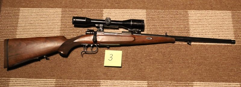 Repetierbüchse im Kaliber 9,3x62 mit Zielfernrohr Zeiss Diatal 6x42, Lauf beschriftet: A. Kopinski Erlangen, Stecher-Abzug, Mauser-System; Schaft-Magazin,