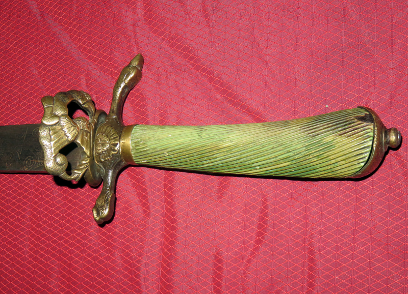 Das Stichblatt hat ein schönes Vogel-Adlermotiv, die Parierstange ist in geschwungener Form von Vogelköpfen.