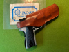 Aus schönem, noch formstabilem braunen Leder, Rechtshand, offen am Lauf und mit einem stahlverstärktem Druckknopfverschluss, eine auch gut passende Waffe ist bei dem üblichen Abmessungsbild dabei