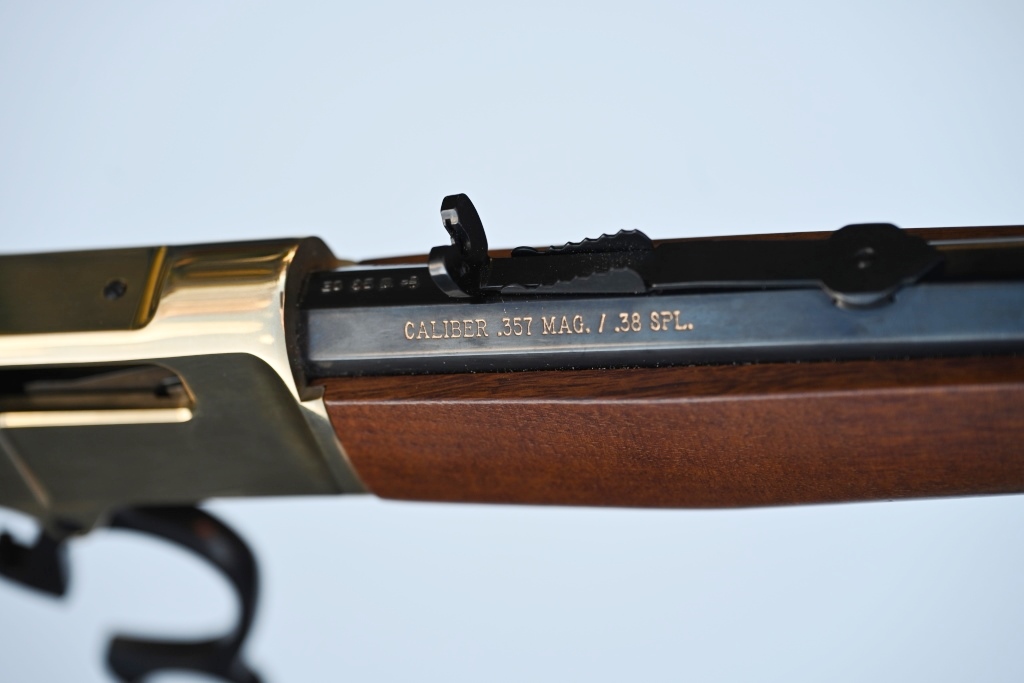 Herstellerschriftzug „HENRY REPEATING ARMS BAYONNE NJ -MADE IN USA“, gültige bundesrepublikanische Beschusszeichen Adler über N, codiert-datiert "BG" = 2016, kleines Importeurzeichen "FWW" (= Frankonia Waffen Würzburg), Kaliberangabe "CALIBER .357 MAG/.38 SPL.", Seriennummer.