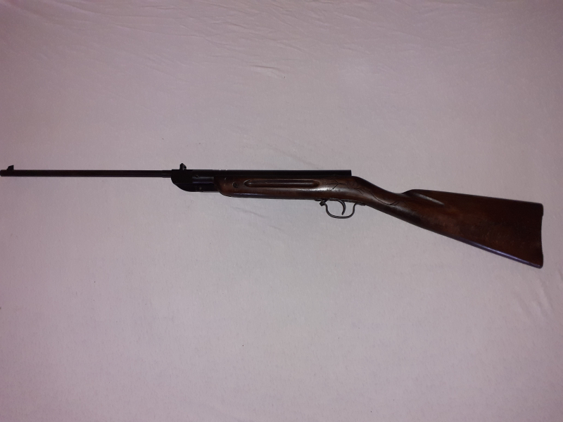 Luftgewehr Haenel Modell I-53, verschießt mit gutem Druck 4,5mm Diabolo. Altersgemäßer Zustand, am Schaft hat sich ein begabter Schnitzkünstler erprobt.
