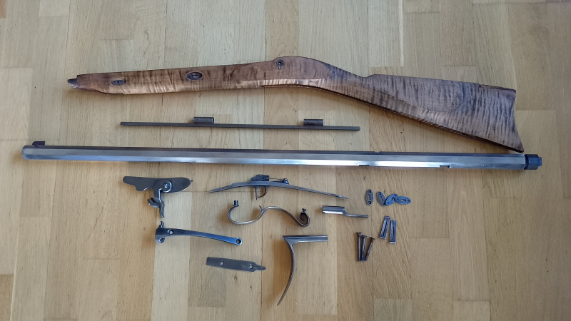 Aus einem Nachlass stammt dieser unvollständige Bausatz einer Hawken Rifle. Ich versuche so gut wie möglich, die vorhandenen Teile zu beschreiben. Alles ist gebraucht. Der Ahornschaft ist gut erhalten, keine Dellen und Ausbrüche und besitzt eine starke Riegelung. Meiner Meinung nach CM3 oder CM4. Im Laufbett sind die Reste einer Laufbettung. Meiner Erkenntnissen nach stammt der Lauf von Dieter Stifter. Er ist 86 cm lang und hat das Kal.50. Innen ist er blank mit tiefen Zügen und außen grob überschliffen. Der Lauf ist nicht beschossen. Die am Ende sitzende Schwarzschraube ist ein unbearbeitetes Schmiedeteil und besitzt keine Bohrung für das Biston. Schloss und Stecher sind amerikanische Bauteile und sehr gut erhalten. Das Schloss besitzt die Nummer SL1327. Alle vorhandenen Teile, die auf dem Foto zu sehen sind, sind blank und in gutem Zustand. Es fehlen ein paar Schrauben und der Abschluss für den Vorderschaft. Da Privatauktion keine Garantie und Rücknahme.