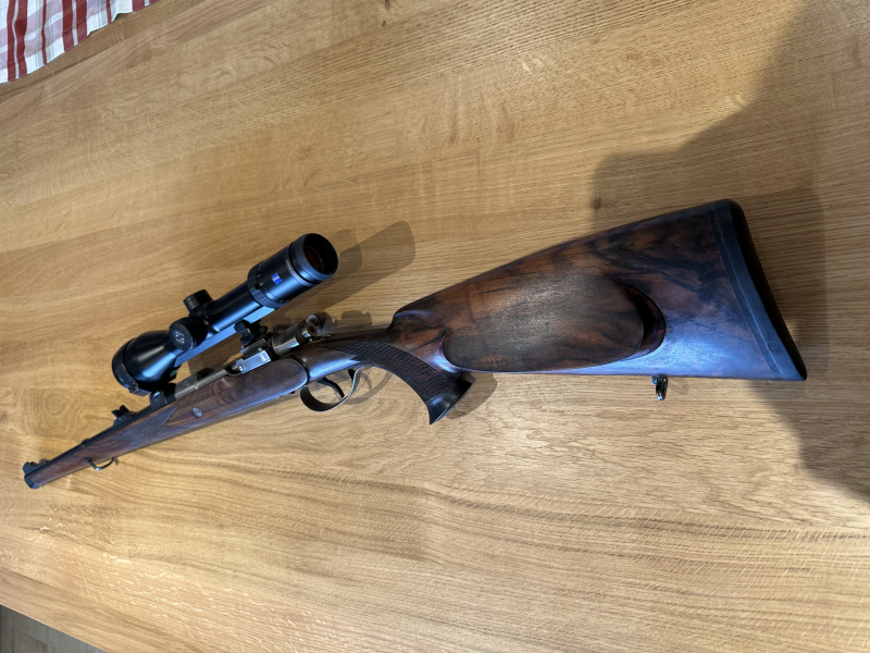 Zum Verkauf steht ein Mauser Stutzen der von der Fa. Storch aufgewertet wurde.Der Stutzen verfügt über hervorragende Gravuren, ein wunderschönes dunkel gemasertes Schaftholz. Zudem ist der Stutzen mit einem Zeiss Victory HT 2,5-10x50 ausgestattet und einer Schwenkmontage. Das Zeiss und die Oberteile der Schwenkmontage würde ich auch für 1400€ behalten falls jemand ein anderes Zielfernrohr besitzt. Der Stutzen ist sehr Schlank und daher gut zu führen, die Magazinkapazität wurde auf 3+1 anstatt 4+1 verringert was ihn auch leichter macht. Über die Schussleistung kann ich selber nichts sagen da der Stutzen seit meinem besitz nur gepflegt wurde und als Sammlerobjekt diente (zur Schussleistung kann man von Mauser nichts schlechtes erwarten). Die Gesamtlänge beträgt 102 cm und 37cm vom Abzug weg. Besichtigung und Abholung vor Ort währe sehr Erwünscht