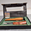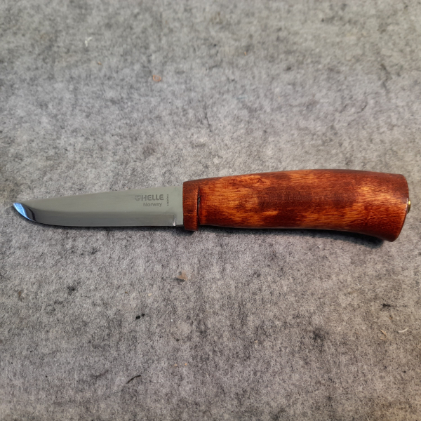 Jagdmesser/Finnenmesser von Helle. Klingenlänge 9cm, Gesamtlänge 20cm, Griff aus geölter Maserbirke. Die originale Verpackung hat Gebrauchsspuren. Privatverkauf, keine Garantie, keine Rücknahme.