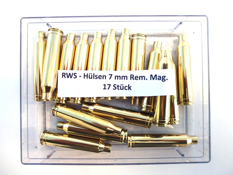 17 Stück RWS - Hülsen 7 mm Rem.Mag. Die Hülsen sind gereinigt, poliert, entzündert und ein Fertigungslos.