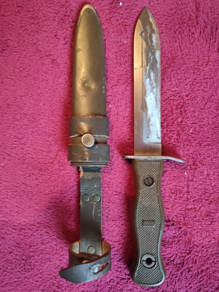 Bundeswehr Kampfmesser mit Stahlscheide. Beschriftung: FKS 69. Auf dem Griff: BW