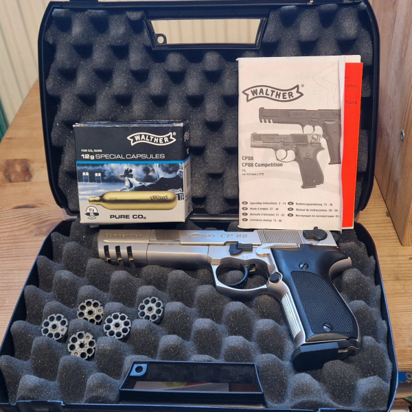 Die Walther CP88 Competition ist ein hochwertiger, originalgetreuer Vollmetall-Nachbau der Walther P88. Sie verfügt über einen verlängerten Competition-Lauf für erhöhte Präzision, einstellbare Visierung und einen Single-/Double-Action Abzug. Die Energie beträgt typischerweise bis zu 4 Joule