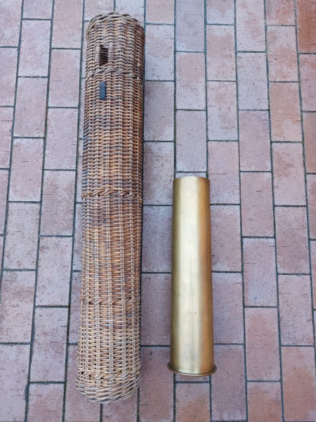Abzugeben ein Mun-Korb für eine Patrone der deutschen 10cm schw. Feldkanone 04/14 (Krupp) inkl. passender ,abgeschossener Kartusche ( Polte/Magdeburg Juli1918).