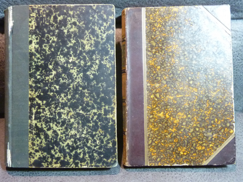 22 x 15,5 cm mit zusammen 637 Seiten Text. Guter gebrauchter Zustand, teils Lederrücken. Beide Bücher vollständig von 1884/1890.