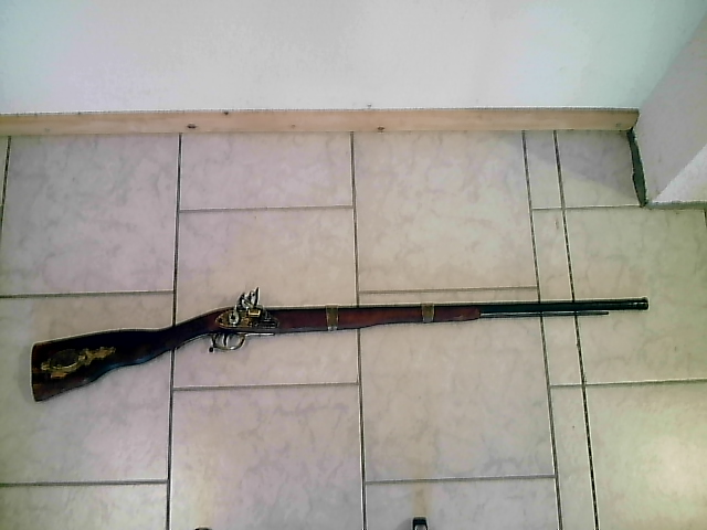 Steinschloss Gewehr (Spritzguss, ähnlich Denix), spannen und abschlagen funktioniert, einziger Makel, Besitzer hat ein Loch im Schaftende gebohrt, (zur Befestigung) dadurch ist der Schaft(Holz) leicht abgeplatzt! Aber für einen Bastler kein Problem zum spachteln! Länge: 113cm; Etwas für Party- oder Hobbyraum!