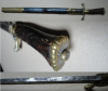 alter Hirschfänger mit Scheide und Beimesser, Messingmontierung, Keilklinge mit beidseitiger Hohlbahn und leider einigen Roststellen siehe Bild 1, Klingenlänge: ca. 45 cm, Klingenstärke: ca. 7mm (breiteste Stelle), Klingenbreite am Griff: ca. 28mm,