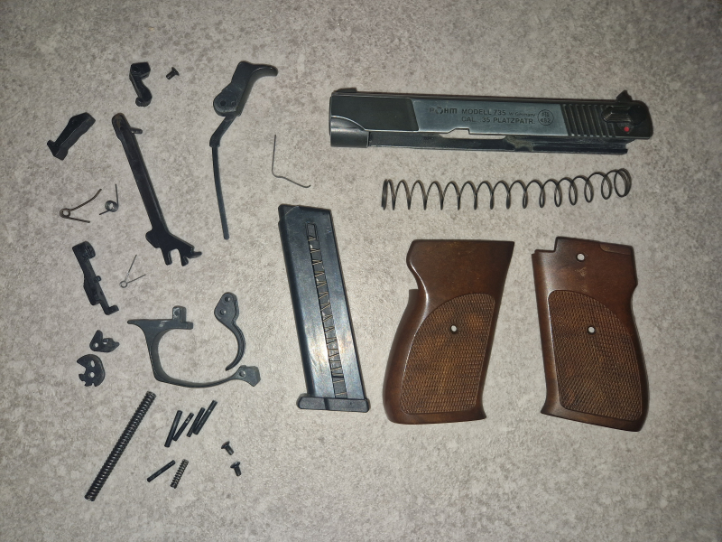 Biete aus Sammlungsauflösung / Hobbyaufgabe dieses Konvolut an. Es handelt sich um freie Ersatzteile einer ehemaligen Röhm Modell 735 an. Der Verschluß hat eine PTB und weisst keine Risse oder ähnlichem auf. Ungereinigt. Die Ersatzteile ansich kann man gut erkennen. Die Griffschalen sind aus Plastik. KALIBER .35!