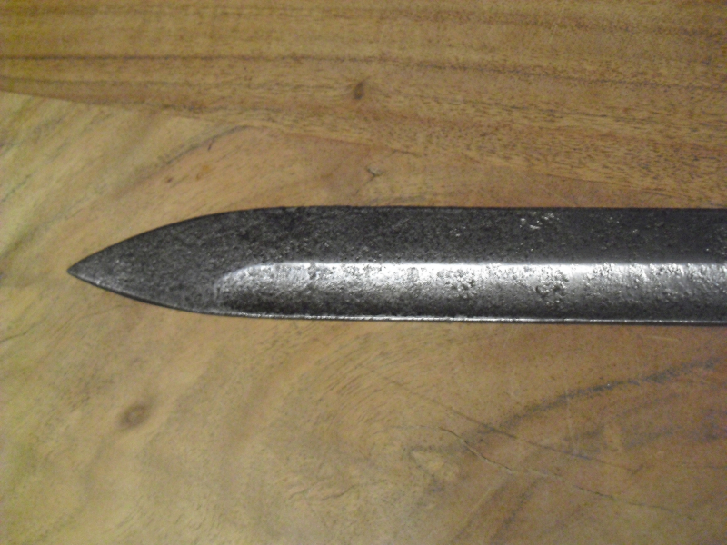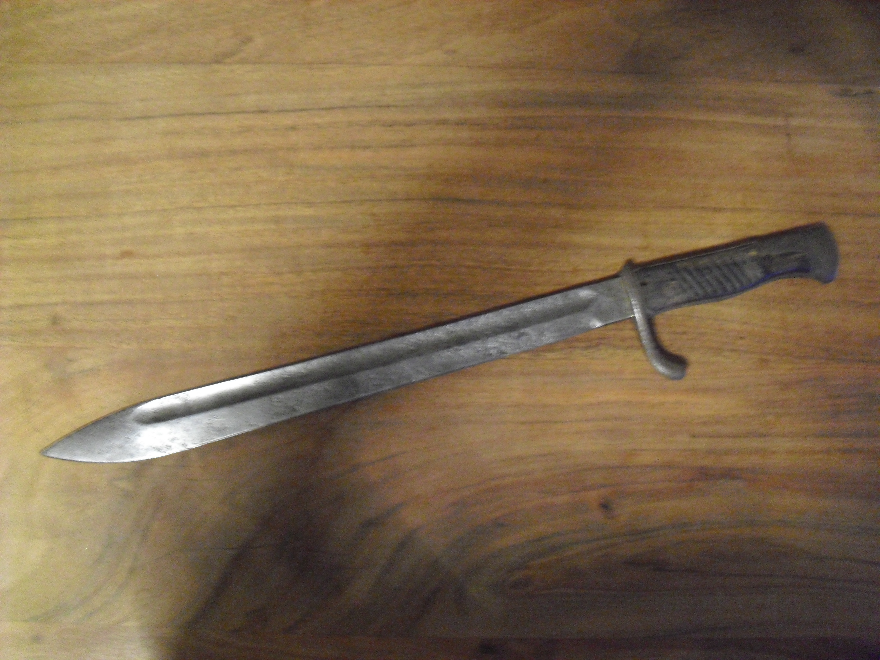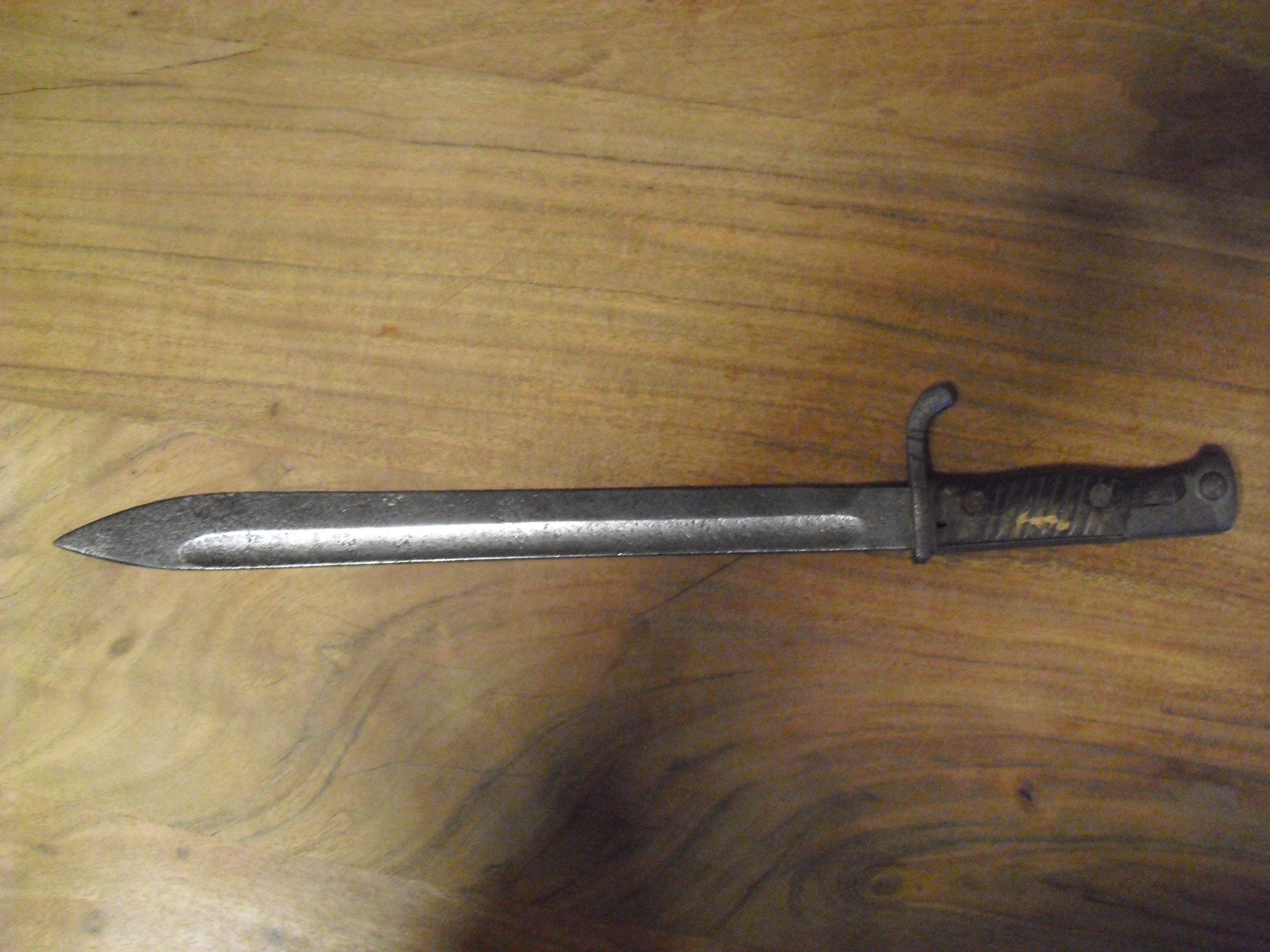Hallo da ich meine Blankwaffensammlung auflösen möchte verkaufe ich hier einige Bajonette und Dolche. So auch dieses Bajonett 98/05 was meines Wissens nach für das Gewehr 98 bestimmt war. Leider habe ich keine Scheide hierfür. Die Klinge hat starke Rostnarben. Die Stempelung Simson & Co Suhl ist gut zu erkennen. Der Verriegelungsdrücker ist fest und die Griffschalen sind Wurmstichig. Schauen sie auch in meine anderen Angebote. Bei fragen bitte melden!