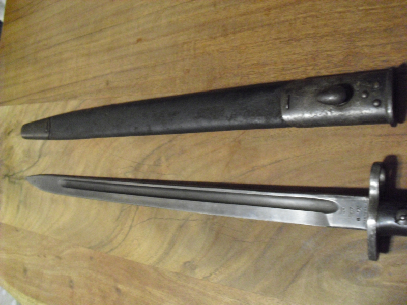 Hallo da ich meine Blankwaffensammlung auflösen möchte verkaufe ich hier einige Bajonette und Dolche. So auch dieses Lee-Enfield Bajonett 1907. Das Produktionsjahr ist meines Wissens August 1915, was an der Bestempelung zu erkennen ist. Der Hersteller ist Sanderson.