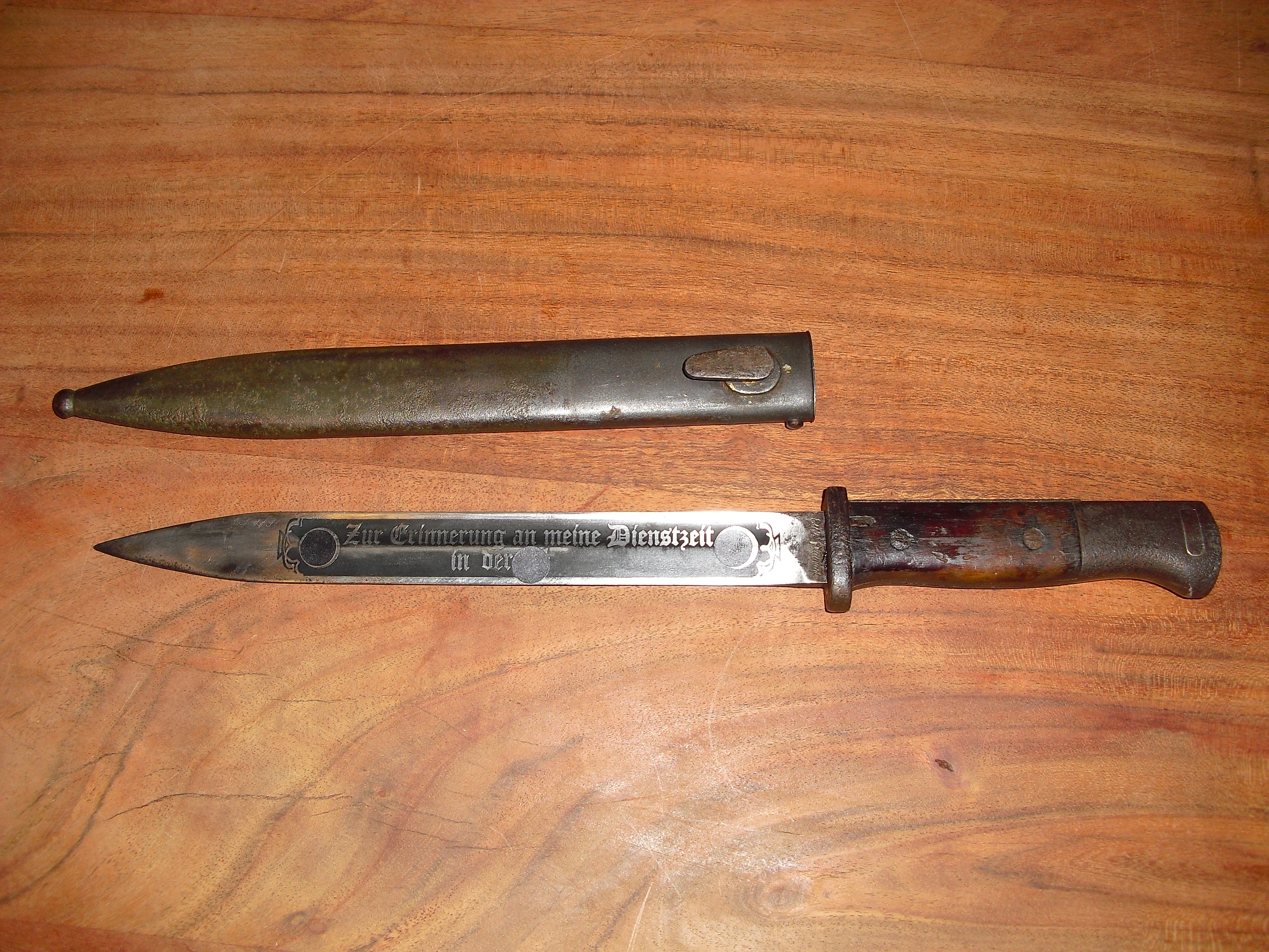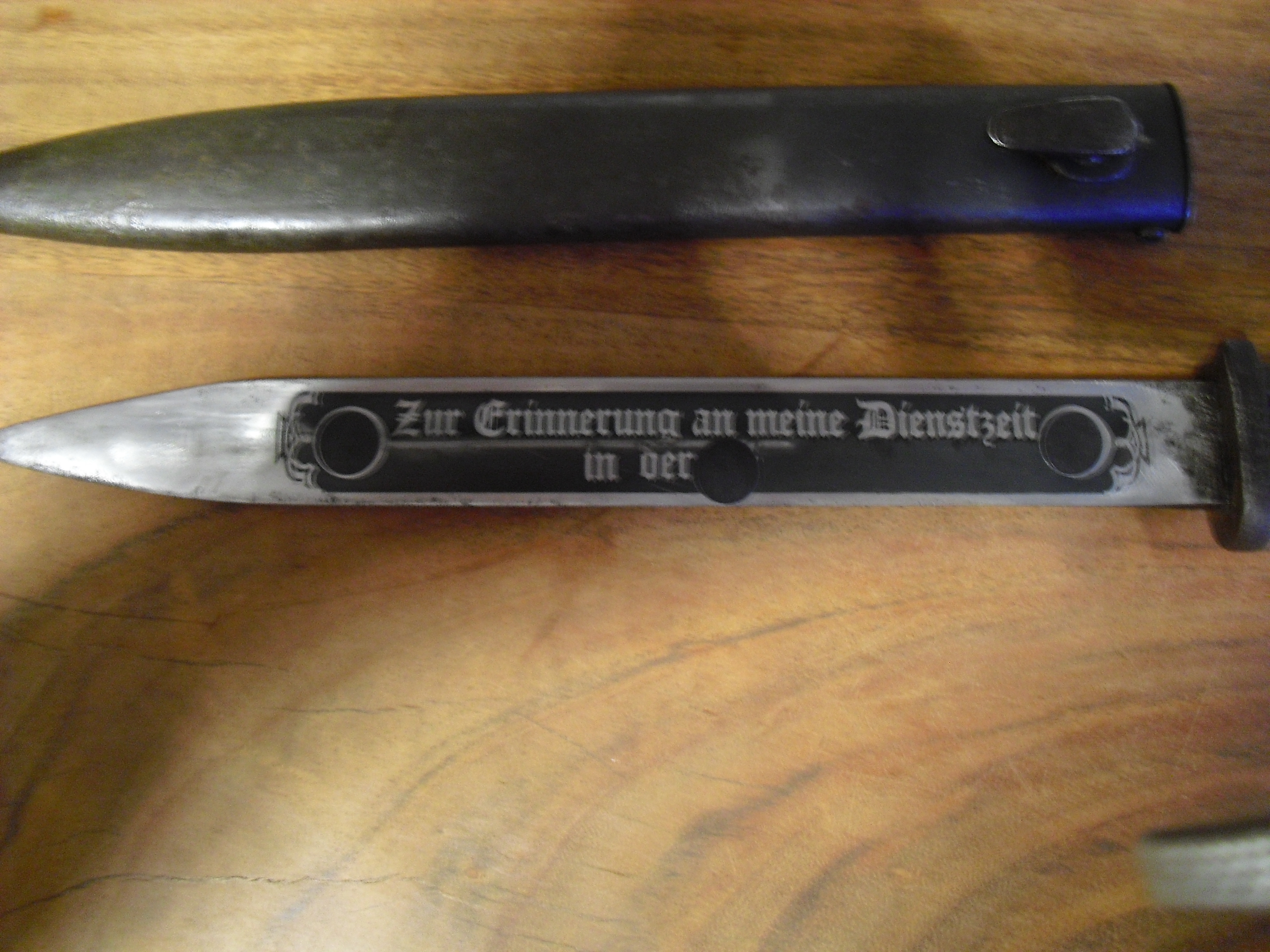 Das Bajonett trägt auf der Klinge beidseitig eine Ätzung. Auf der einen Seite steht: "ZUR ERINNERUNG AN DEINE DIENSTE IN DER SS" und auf der anderen Seite: "2. SS PANZERDIVISION DAS REICH". Oben auf dem Griff ist das Zeichen der Panzerdivission zu erkennen. Der Hersteller des Bajonetts ist Elite Diamant auf der äußeren Kante ist die Zahl 38 zu erkennen. Der Drücker ist gängig und die Feder schiebt ihn zurück. Die Ätzung macht einen sehr guten Eindruck und kann ggf. auch nachträglich gemacht worden sein. Hierfür ist mein Fachwissen nicht groß genug. Die Scheide ist mit COF 43 gestempelt (Waffenfabrik Carl Eickhorn, Solingen) und stellenweise Rostnarbig. Für die Bilder wurden die Runen abgeklebt. Das Bajonett sitzt fest in der Scheide. Bei Fragen bitte melden!
