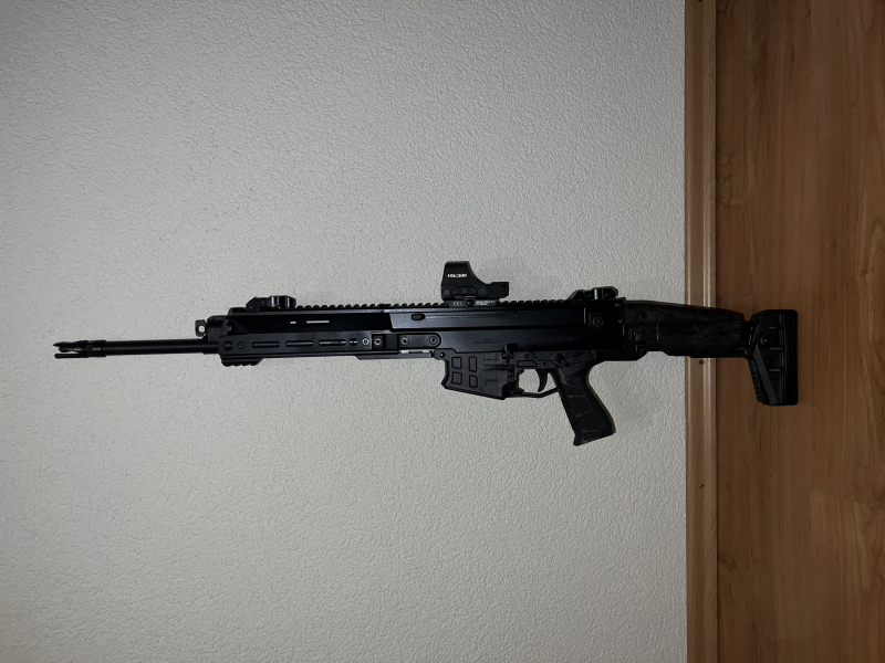 Die Waffe ist im Kaliber .223 Rem, kommt mit mehreren 10 Schussmagazinen, plus Zubehör siehe Bilder. Die Holoson Optik ist ebenso mit inbegriffen.