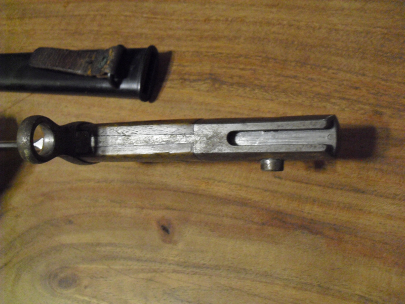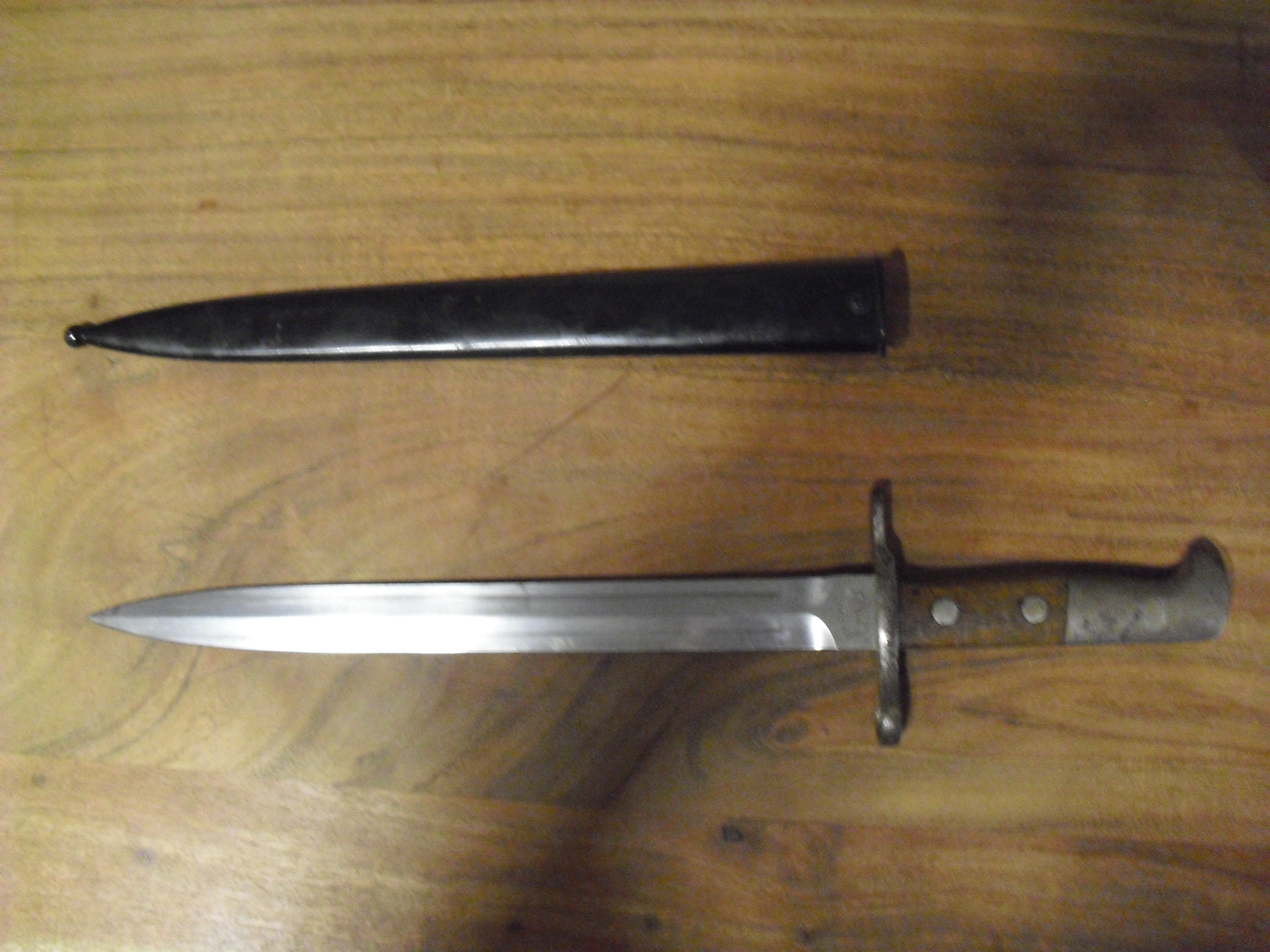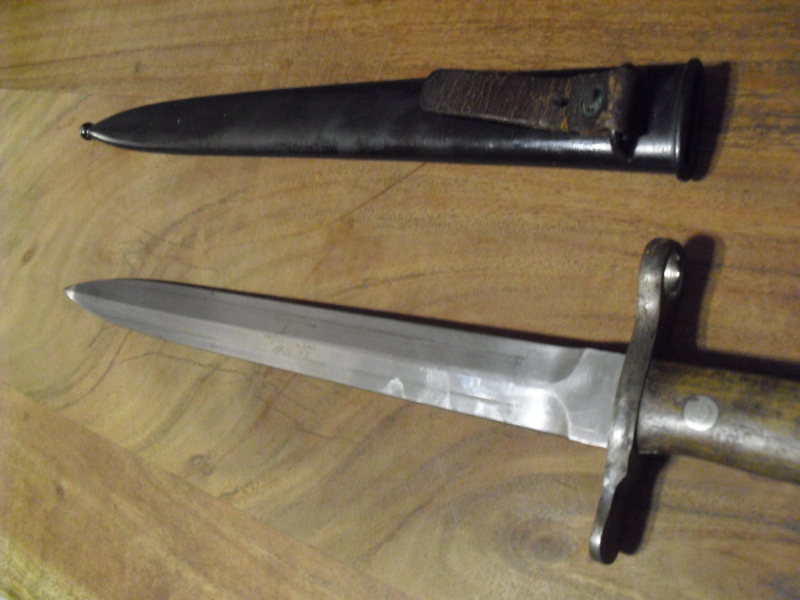 Hallo da ich meine Blankwaffensammlung auflösen möchte verkaufe ich hier nach und nach meine Bajonette und Dolche. So auch dieses Schweizer 1918 Bajonett für die K31 und K11 Gewehre. Der Zustand ist wirklich gut. Die Dolchklinge zeigt den Hersteller Waffenfabrik Neuhausen und die Nummer 541602. Die Scheide ist noch schön schwarz und die Lederlasche ist heile. Die Klinge sitz fest in der Scheide, der Drücker ist gängig und wird von der Feder zurück geschoben. Schauen Sie auch in meine andern Angebote. Bei Fragen bitte melden!