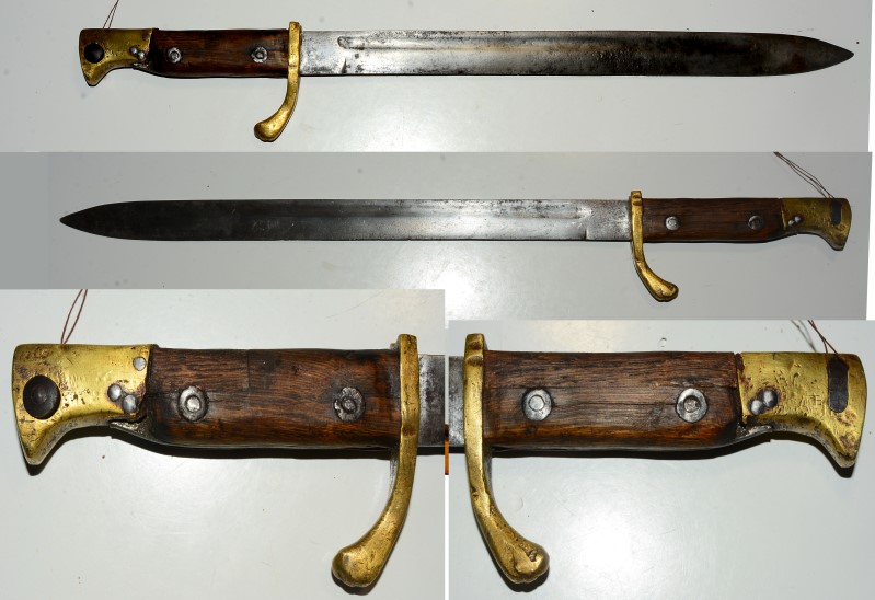 Deutsches Behelfsbajonett, ich denke Feldfertigung, Klinge zumindest aus anderer Klinge geändert, Parierbügel und Knauf aus massiem Messing gefertigt, Griffschalen grob vernietet, um 1916