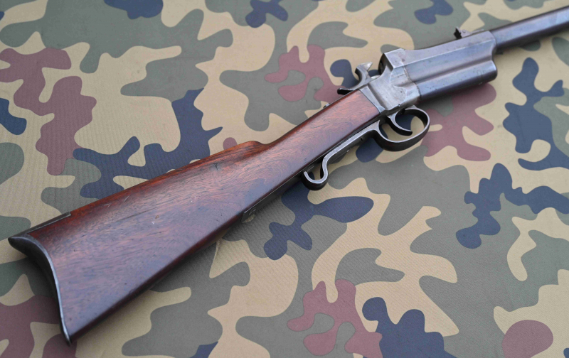 Wenn überhaupt, findet sich dieses Waffenmodell in der mehrschüssigen Variante mit Röhrenmagazin für 7 Patronen. Dieses einschüssige Stück hier ist vermutlich ein unmittelbartes Vorläufermodell!