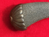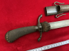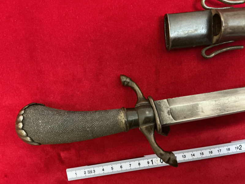 Aus Nachlass….Hirschfänger, wohl süddeutsch. Komplette Eisenmontierung. Zugehörige, passende Lederscheide. Diese gut erhalten, Gebrauchsspuren. Griff mit Rochenhaut. Beimesser fehlt, Klinge gut, minimale Anlaufspuren. Keine Rostnarben. Sehr schönes Stück.