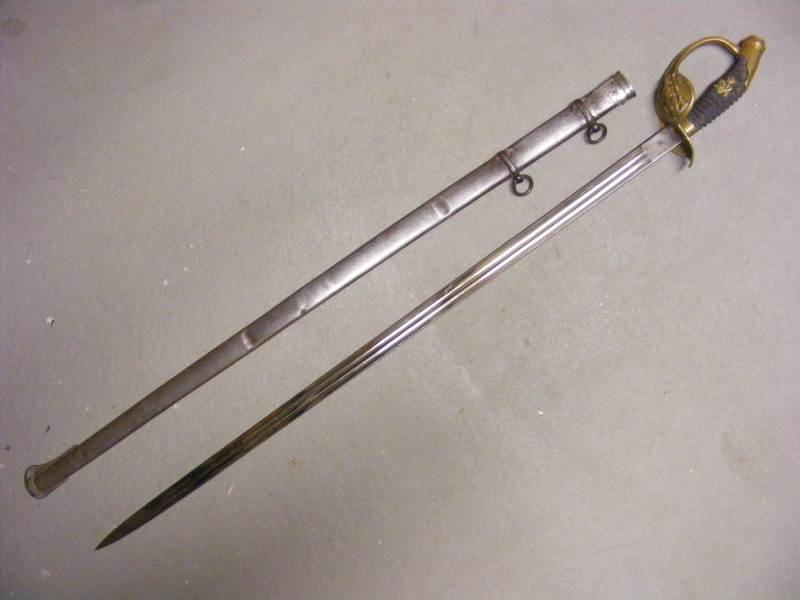 Preußischer Infanterie Offiziers Degen Modell 1889. Gerade Klinge mit 2 Hohlkehlen, einwandfrei, ohne Scharten, Länge: 84 cm, Breite: 25 mm. Die Scheide hat ein paar leichte Dellen, beeinträchtigt aber nicht die Funktion. Hersteller "Otto Mertens, Solingen". Scheide und Klinge mit "717" gemarkt. Fingerschlaufe ist intakt.
