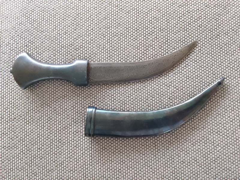 Indisches Messer ca.1920 Hochwertige Damast Klinge. Stahl Griff und Scheide. Schwarz bruniert. Ca 30cm