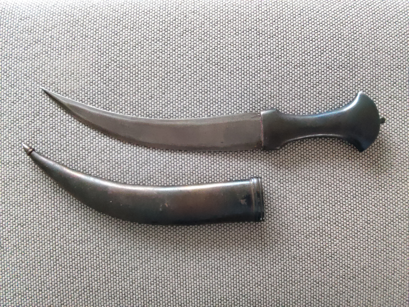 Indisches Messer ca 1920. Hochwertige Damast Klinge. Stahl Griff und Scheide schwartz bruniert. Ca 40cm