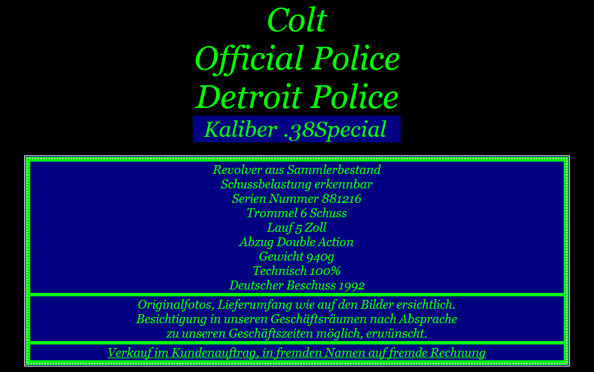 Artikel-ID: 20270845  •  ArtikelNr. des Verkäufers: 12072  •  Kategorie: Grosskaliber Kurzwaffen > Gebrauchsrevolver > Colt