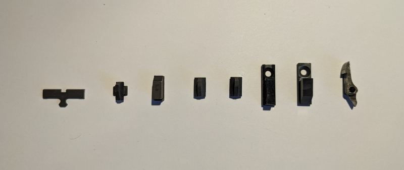 Sie bieten auf ein Konvolut von verschiedenen Teilen. 1x Abzugklinke unbekannt, 1x Visierblatt Hämmerli, 3x Korn mit Schwalbenschwanz 2mm, 1x Korn 5mm, 1x Korn 5,5mm und 1x Plexikorn mit 4mm. Ohne Gewähr und Rücknahme.