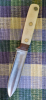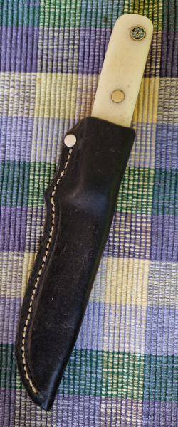 Tolles Jagd- und Brotzeitmesser - Eigenfertigung - in ausgezeichnetem Zustand nach Herstellung. "Condorklinge", Custom Kephart Blank Blade,1075 HCS, COCB247-45 HC, nicht rostfrei, 11,5 cm lang. Griffmaterial Knochen unterlegt mit Nußbaunholz, goldfarbene Nieten und Zierpin. Dazu exakt angepaßt eine Lederscheide mit sogen. "Ploppsicherung". Das Messer sitzt sicher und fest und ist dennoch sofort einsatzbereit.
