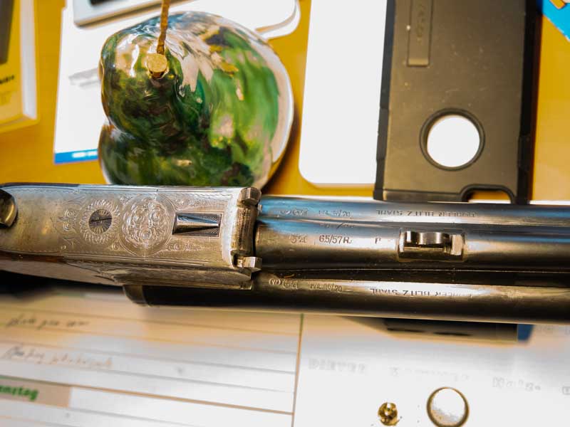 Der Drilling war eine von mehreren Waffen im Besitz einer Jägerin und wurde nur hin und wieder geführt. Es gibt entsprechend geringe, aber sichtbare Gebrauchsspuren. Der Verschluss verriegelt satt, die Zielfernrohrmontage ist ohne Spiel.