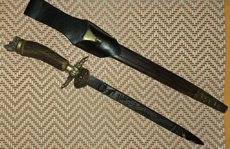 Ca 33 cm Klinge dreiseitig mit Jagdmotiven und Anspruche geätzt.