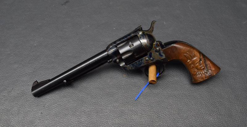 einstelbare Visierung, 6-Schuss Trommel. Holzgriffschalen mit Verschneidung, rechts Indianer, links Adler.