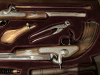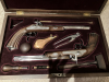 1 Paar Duellpistolen - Replik. Die 2 Vorderlader-Pistolen befinden sich in einer Holzkassette mit reichhaltigem Zubehör u.a. Kugelzange, Pulverdose, Ladestock, Holzhammer. Zustand siehe Fotos.