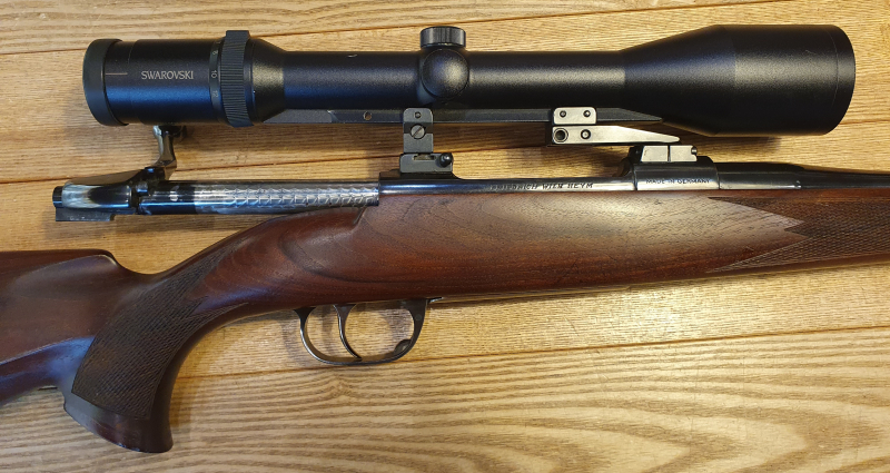 Cal. 30-06 Spr mit Rückstecher Gute Schußleistung (4cm / 100m), Beschuss 1994 Lauflänge 60cm, Schaftlänge 38cm (Schaft wurde einmal fachmännisch verlängert) Schwenkmontage mit Swarovski Habicht 3-9×50, Absehen 4 (1.Bildebene)